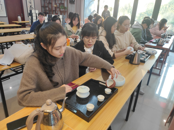 “茶韵书香”主题课程特别邀请了江苏省茶叶研究所、高级茶艺师、品茶技师田晓兰主任讲授。田晓兰向同学们介绍了有关茶的基本知识,如茶的起源、茶文化历史、习俗流变、健康价值等。同样来自江苏省茶叶研究所的高级茶艺师钱雪飞老师则指导同学们学习了茶艺和泡茶喝茶礼仪。理论课结束后,大家前往江苏省茶叶研究所,学习盖碗泡茶的技艺,品鉴无锡毫茶、安吉白茶等的不同风味,于茶香氤氲中进一步感受中国传统茶文化中的蕴含的丰富内涵。