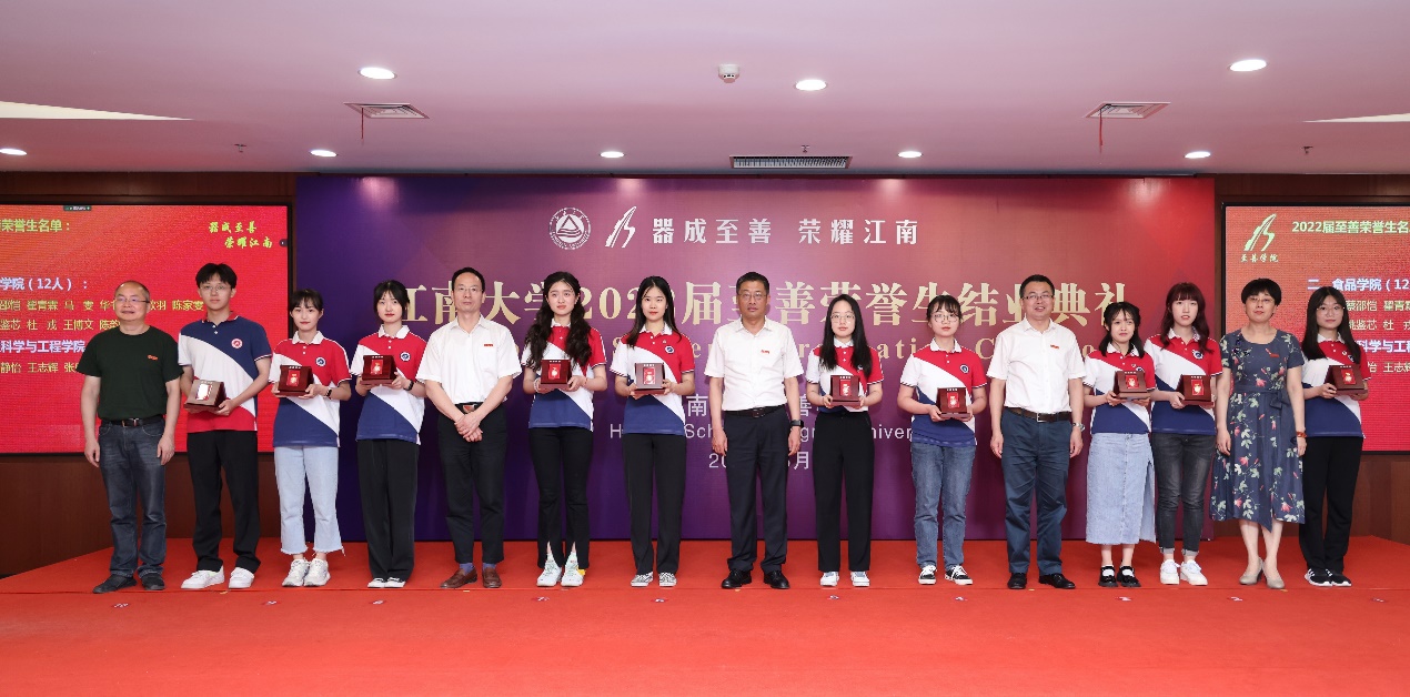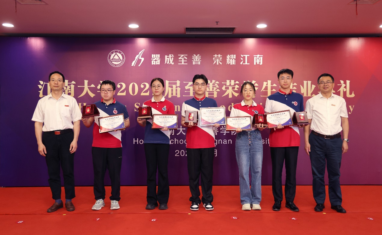 典礼上,堵国成宣读了2022年度“至善特别荣誉生奖”的表彰决定,来自食品学院的毛乡芸、物联网工程学院的张宇彦、理学院的张源哲、陆雨洁和人工智能与计算机学院的杜昊五位同学获此最高荣誉。堵国成、刘立明共同为获奖者揭牌并颁发金质至善荣誉勋章、荣誉证书。王立言为获奖者颁发奖金牌并致祝贺词。随后,徐学明代表至善学院管委会宣读了学校授予2022届至善结业生荣誉称号的决定。在全场师生的见证下,陈卫、堵国成、刘立明、徐学明和张菁燕为每位至善荣誉生颁发了荣誉勋章,整个典礼的气氛达到了高潮。