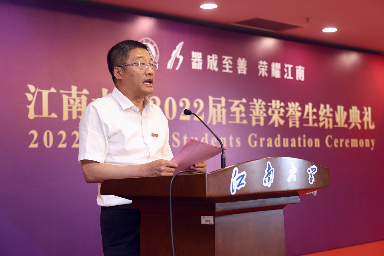 6月15日下午,江南大学2022届至善荣誉生结业典礼在图书馆五楼报告厅举行。江南大学校长陈卫,校党委常委、副校长、至善学院院长堵国成,无锡源清天木生物科技有限公司董事长兼总经理王立言、至善学院常务副院长刘立明、教务处处长兼至善学院副院长徐学明、学生工作处处长兼至善学院副院长张菁燕、至善学院副院长单筱婷等领导出席典礼,至善学院特聘指导教师、至善任课教师代表以及在校2022届至善结业生共同参与庆典。典礼通过腾讯会议同步进行直播。