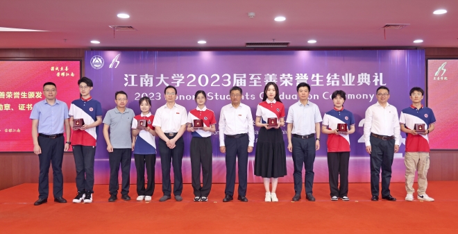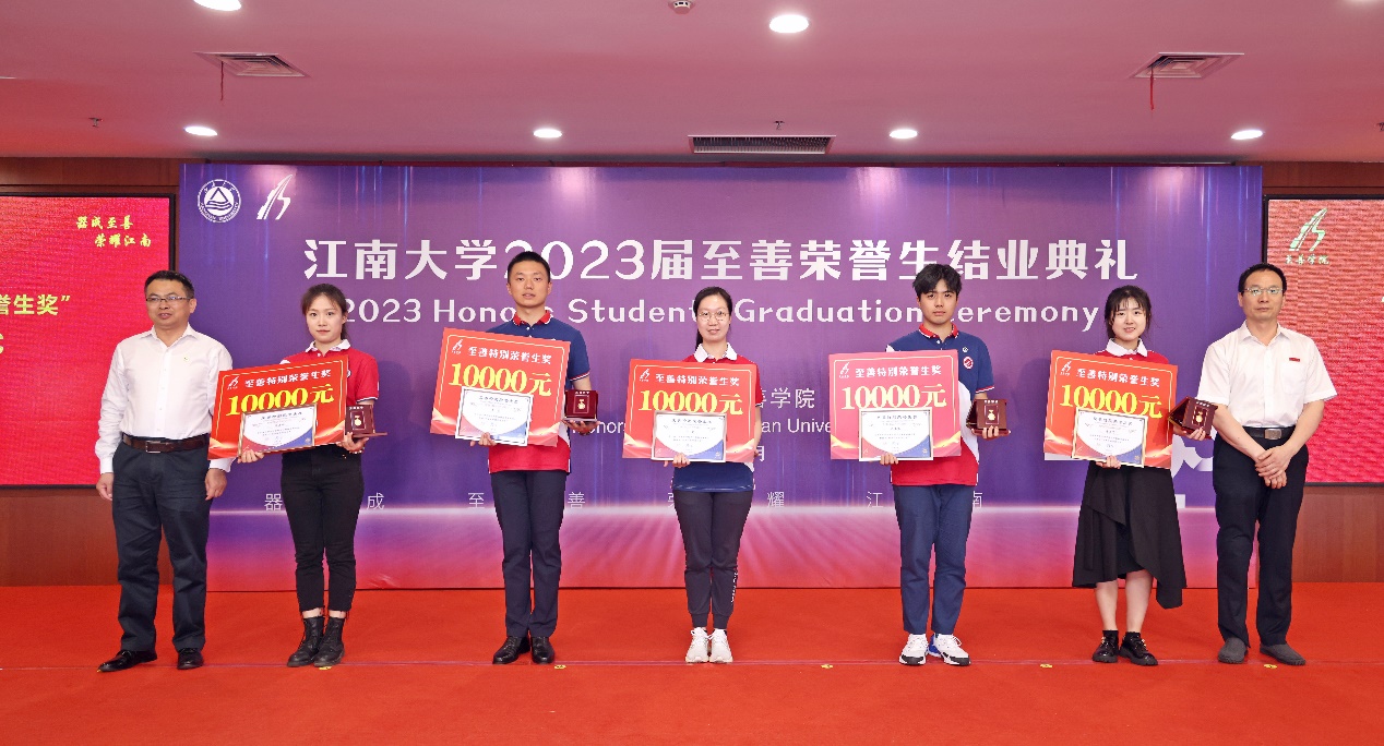 堵国成宣读《关于表彰江南大学2023年度“至善特别荣誉生奖”的决定》,来自生物工程学院的潘子翯、商学院的韩赛鸿、生命科学与健康工程学院的孙莹、法学院的龙腾和人工智能与计算机学院的孟辰烨五位同学获此最高荣誉。堵国成和刘立明共同为“至善特别荣誉生奖”纪念铜牌揭牌,并为“至善特别荣誉生奖”获奖者颁发金质荣誉勋章、荣誉证书和奖金牌。刘立明宣读《关于授予2023届“至善荣誉生”称号的决定》,领导们为所有的至善结业生颁发见证优秀学子们拼搏和进取的荣誉勋章。