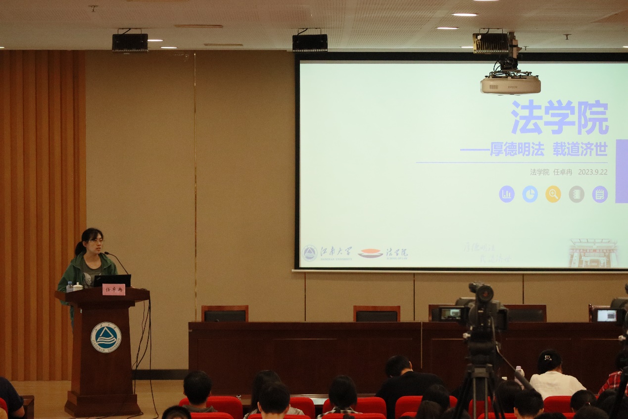 任卓冉介绍了法学院的专业特色和发展现状。她指出法学的学习不仅要依赖于书本知识的背诵,还要在现实案件中注重思考和判断,如何在法理与实际情况中取得平衡是法律学习的一个重点。同时任卓冉介绍了学院开展的各项社会实践活动,并以此来向同学们阐明,学法的目的是维护社会公平正义并对此做出贡献。任卓冉还以社会真实案件为例,告诫同学们遇事要运用法律手段来保护自己的权益。