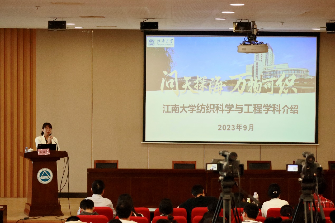 张丽平开展了以“问天探海,万物可织”为题的学科介绍。张丽平首先介绍学院在人才培养、科学研究、专业建设上的发展。她认为,纺织行业不仅是一个关乎国计民生的行业,还是一个满足国家发展战略需求的先进行业,是一个新兴产业,要把纺织学科跟化学、材料、计算机、商务等等各个学科纵向贯通,实现原材料加工技术应用领域的一体化改革,实现横向与纵向的交叉融合,开发“纺织+”的学科新专业。