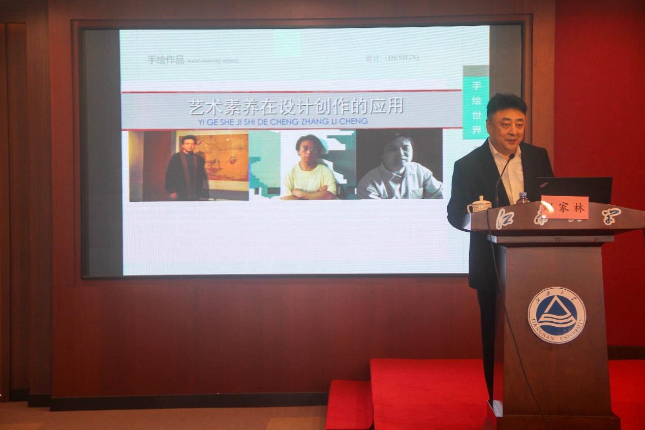 首先,赵家林老师以“艺术素养在设计创作的应用”为主题,分享了自己生命中的三位恩师对他的指导。其中,他的父亲赵永安先生擅长国画与琵琶,对他产生了深刻的影响。他还与大家分享了父亲演奏琵琶的精彩片段。在讲述自己的设计求学历程时,赵家林老师强调了设计图示中透视关系的重要性,并指出真正的设计应当体现出历史底蕴。他带领同学们分析了多个设计案例,提出了用盐渍表演岩洞肌理的创新手法。尽管手绘具有色彩精确与表现灵动的优势,但随着计算机科技的进步,赵家林老师对设计手绘的危机感越来越强烈。他引用张泉灵的一句话:“时代抛弃你的时候,连声招呼都不打一声。”他认为,要积极将计算机技术运用到设计之中,使二者有机结合。