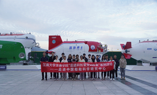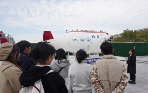中国船舶科学研究中心相关负责老师对学院师生一行到访表示亲切欢迎。在讲解员的带领下,师生一行主要对“蛟龙”号、“深海勇士”号、“奋斗者”号等深海装备广场、展厅以及大型耐波性操纵性水池进行了实地参观。