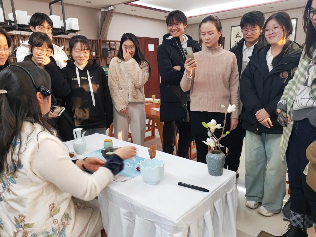 实践课程知行合一,在实践中学习体悟传统文化魅力。课程第三讲,至善生们前往江苏省茶叶研究所,观摩茶艺师精湛的茶艺演绎,在老师的指导下进行了盖碗红茶茶艺实操,亲身体验茶道的文化内涵与茶艺之美。巧煮甘泉、超尘脱俗、摆盏净杯……一道道程序极具传统文化内涵;泡茶、品茶、奉茶……举手投足间尽显中华礼仪之美。第四讲中,田晓兰对宋朝的点茶文化进行了综合、全面的讲解,随后带领同学们在实践中学习点茶技艺。在课程的最后,至善生们亲身实践茶汤上“幻变”的绝技——茶百戏。以茶汤为纸,茶膏代墨,同学们在茶碗中尽情发挥创造力,在绘画中切身感受宋朝文人风雅。