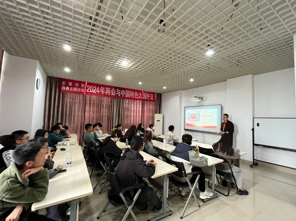 3月23日,至善学院自由主题沙龙《2024年两会与中国特色大国外交》在图书馆812如期开展。此次沙龙的主讲人是江南大学马克思主义学院副教授、硕士生导师孙晨光老师。活动由2023年度至善生顾雨辰、董一平负责组织。本次沙龙以2024年全国两会为出发点,延伸到国内外的热点问题和前沿事件,帮助同学们树立国际视野,培养全局思维。