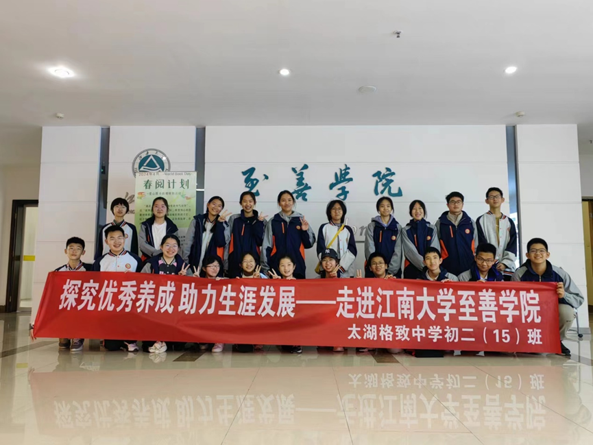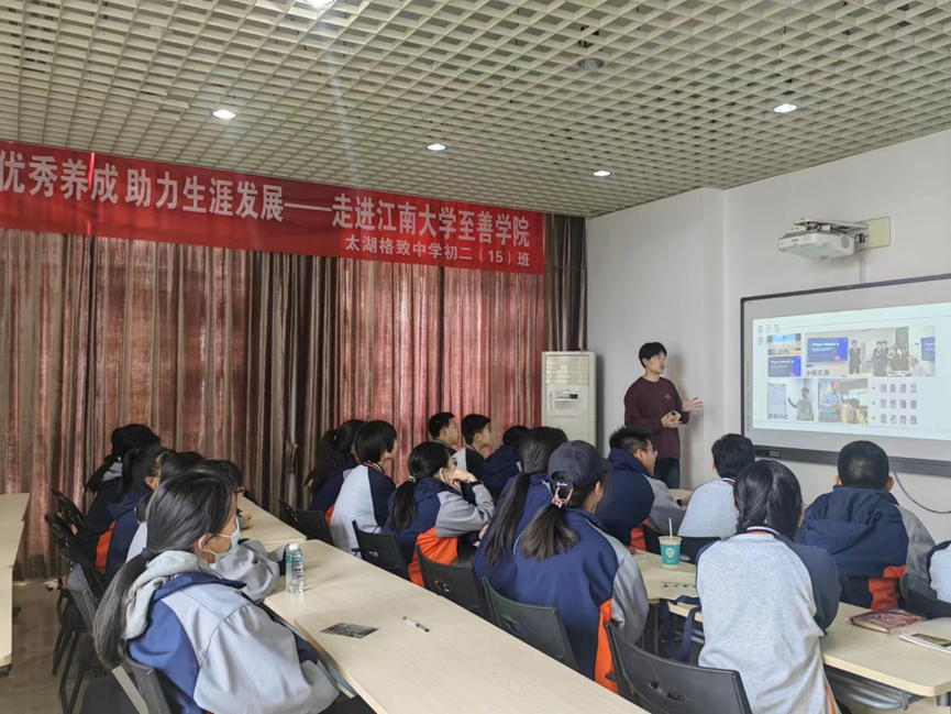 4月4日,江南大学至善学院迎来了一群特殊的访客——太湖格致中学初二(15)班的24位同学及他们的班主任。在至善学院学生会的精心安排下,同学们开展了一场丰富多彩的社会实践活动,通过图书捐赠、交流学习及实地参观等方式,共同探索优秀习惯的养成与生涯发展的奥秘。上午,至善学院举行了“春阅计划”图书捐赠活动,格致中学初二(15)班的同学们积极响应,纷纷捐出心爱的书籍,以实际行动向偏远地区的青少年传递知识与爱心。至善学院对同学们的善举表示衷心的感谢,并为他们颁发了志愿者证书等纪念品。