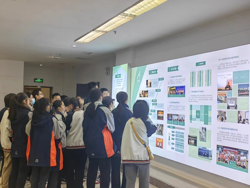 随后,至善学生会成员余秉谦带领同学们参观了至善学院的简介墙。通过详细的介绍和生动的图片展示,同学们深入了解了至善学院的办学历史、目标、发展概况及知名校友等内容,对学院产生了浓厚的兴趣。