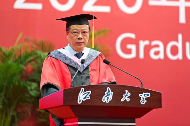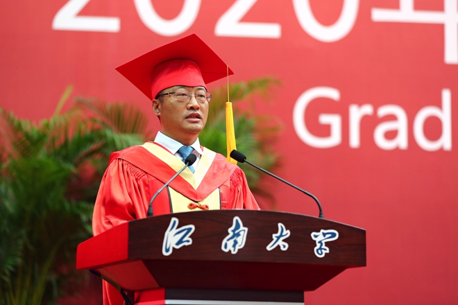 陈卫发表了题为《相信——前行的力量》的讲话,向全体毕业生送上最衷心的祝贺与最诚挚的祝愿,感谢大家在特殊时期的坚守,并给予学校的深切理解和配合。陈卫为在疫情防控斗争中勇毅、坚强、拼搏的江南学子感到无比自豪,相信大家定能勇担新时代赋予的光荣使命,在纷繁复杂的世界和充满不确定性的将来中,找到未来的方向和前行的力量。他对毕业生提出三点期望,希望他们关注自我提升,相信宁静致远的力量;希望他们关心国家发展,相信科技创新的力量;希望他们关切社会进步,相信情怀大爱的力量。祝福毕业生未来无限精彩!陈卫热情洋溢的讲话赢得了在场师生的阵阵掌声。