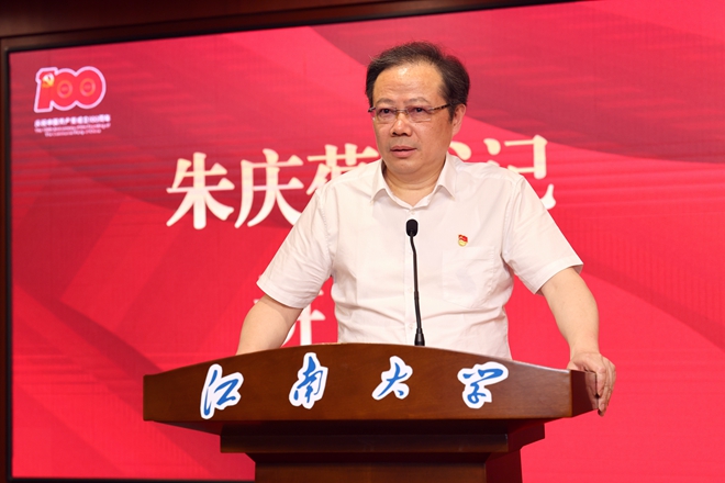 朱庆葆代表学校党委向获颁纪念章的老党员们致以最崇高的敬意并发表讲话。他指出,建党100周年前夕,党中央组织号召为老党员颁授“光荣在党50年”纪念章,是我们党尊老爱老的体现、正视历史的表达,是我们党饮水思源的感恩、传承弘扬的赓续。老领导老同志在不同历史阶段,为党和国家教育事业作出了殷实贡献,为学校高质量发展打下了坚实根基。他表示,江南大学是一所具有光荣传统的大学,每一位老党员都是学校奋斗史上的一个缩影,是江南风格的一种象征。回望过去奋斗路,学校老党员们用最美的年华和毕生的精力,书写了一部接力探索的“奋斗史”,要永远铭记他们的卓越贡献,凝聚对他们的感激之情,让党的关怀真切温暖每一名老党员的心;立足现在正当时,学校老党员们主动作为、发挥余热,为落实立德树人贡献了一本鲜活的“教科书”,要持续为老党员们发挥作用创造积极条件,让红色基因、关爱文化薪火相传、生生不息;眺望未来前行路,学校老党员们坚持党的宗旨,执着于理想信念、忠诚于教育事业等精神,是学校践行初心使命、可持续发展的“传家宝”,要以他们为榜样,从党的百年历史中汲取智慧力量,把老同志们为之奋斗的党的伟大事业不断推向前进。朱庆葆最后强调,当前,时代的接力棒已传到我们手上,大家要更加紧密地团结在以习近平同志为核心的党中央周围,不忘初心、牢记使命,继承党的光荣传统,勇担时代赋予的重任,为加快建设“世界知名、中国一流、江南风格”的研究型大学努力奋斗,为实现中华民族伟大复兴作出新的更大贡献。