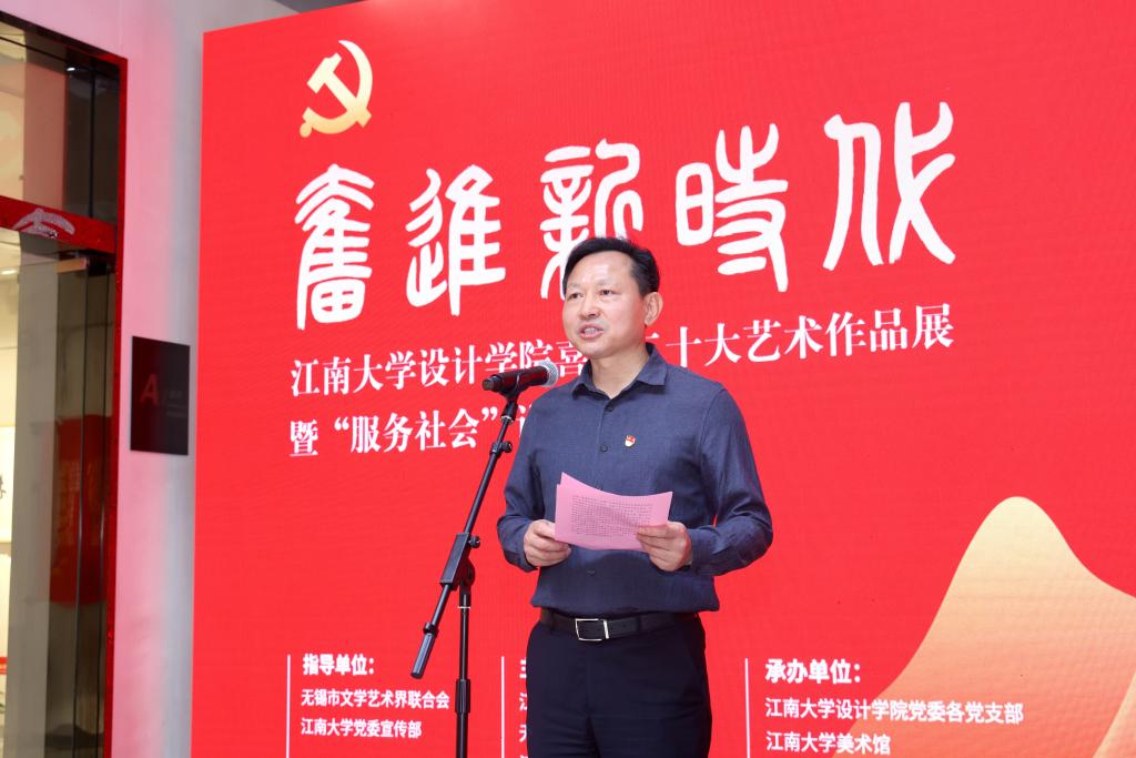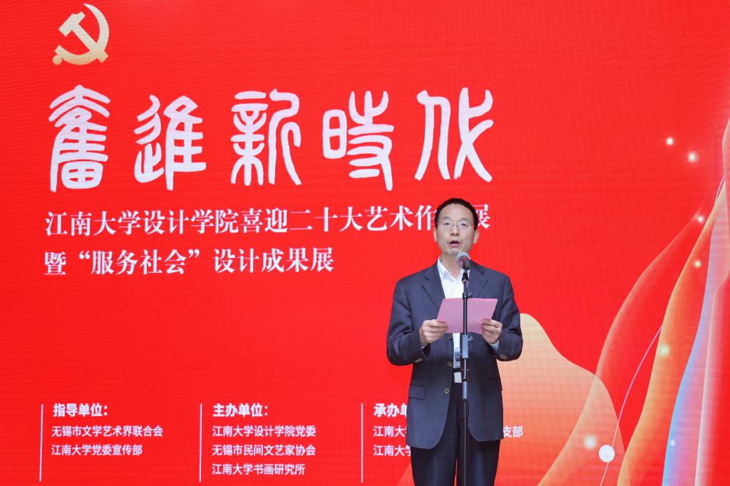 10月14日上午,奋进新时代—江南大学设计学院喜迎二十大艺术作品展暨“服务社会”设计成果开幕式于江南大学美术馆举行。江南大学党委常委、副校长堵国成,无锡市文联党组书记、主席杨建,江南大学党委组织部常务副部长方正泉,江南大学设计学院首任院长张福昌,江南大学书画研究所所长、无锡书法协会名誉主席王建源,江南大学社会科学处处长王建华,江南大学设计学院院长魏洁,江南大学设计学院教授、无锡民间文艺家协会主席王峰,无锡中糖公司、无锡荣巷书社董事长徐立平,以及相关职能部门负责同志、设计学院班子全体成员、教工党支部书记、党员教师代表、学生党支部书记及党员代表、江南大学书画研究所部分研究员代表出席。开幕式由江南大学设计学院党委书记邱建平主持。