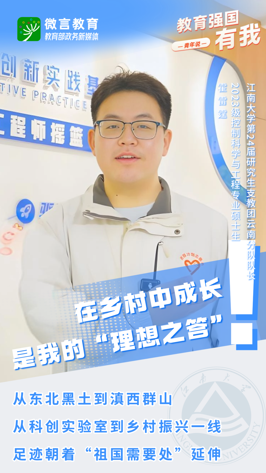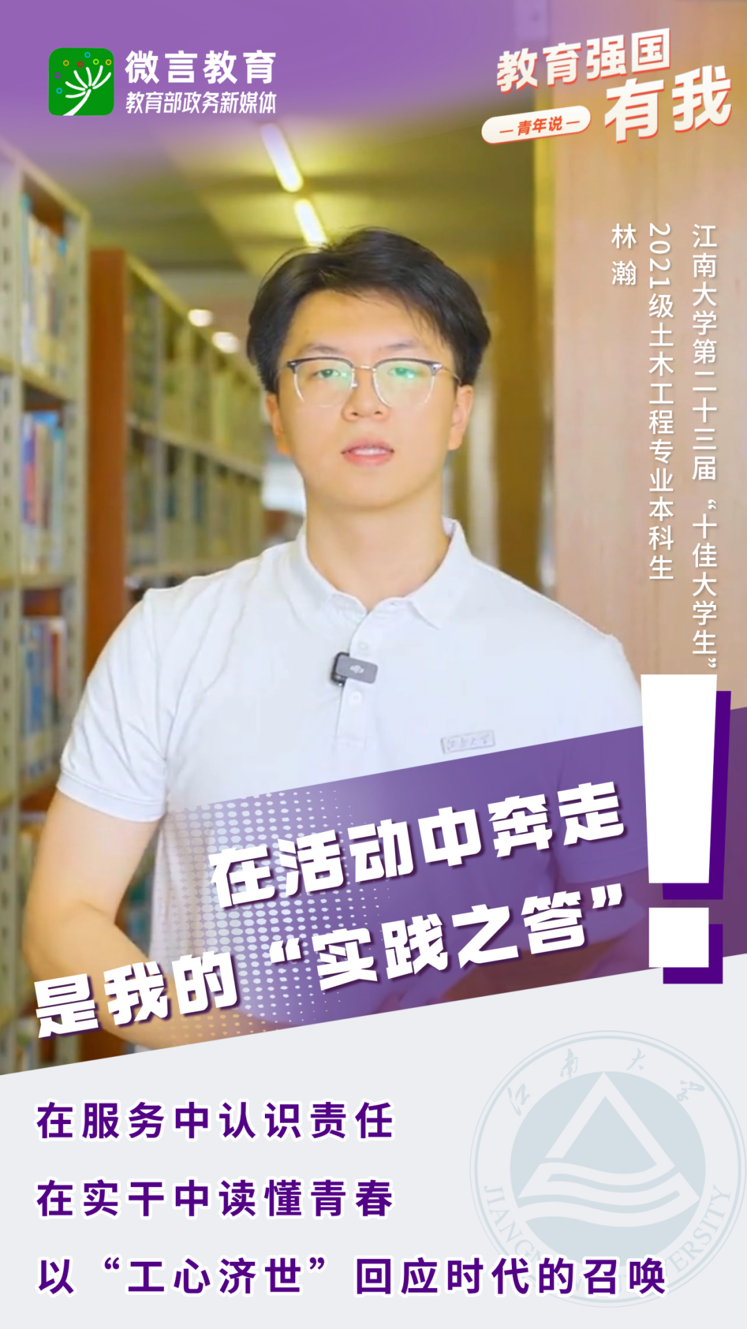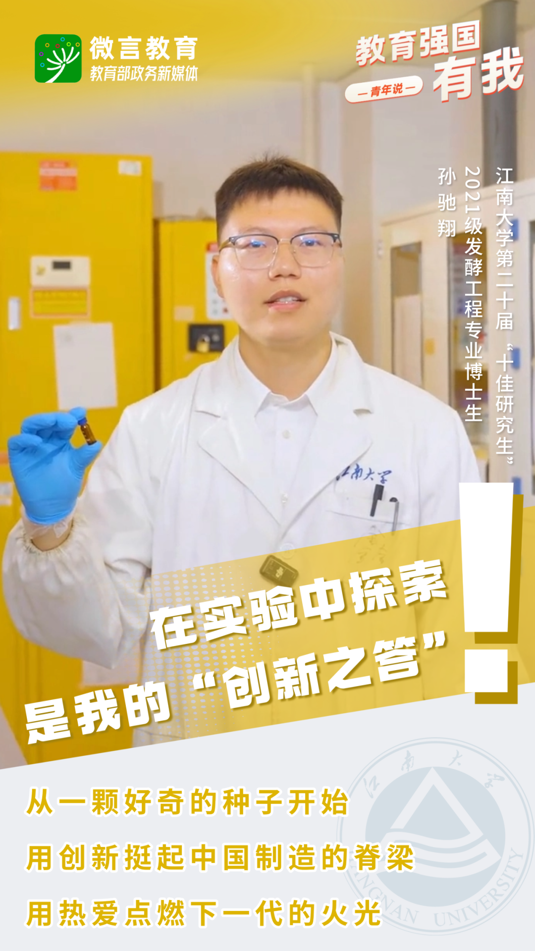【微言教育6月2日】习近平总书记强调,全面推进强国建设、民族复兴伟业,正是年轻一代展示才华、大显身手的好时候。教育强国建设,青年何为?日前,教育部政务新媒体推出“教育强国,有我!”网络主题宣传活动之“青年说(奋进篇)”系列,展现青年师生以青春之我、奋斗之我投身教育强国建设的生动实践。今天,跟教育小微通过1个微视频和1组海报,共同感受江南大学青年学子的时代答卷。