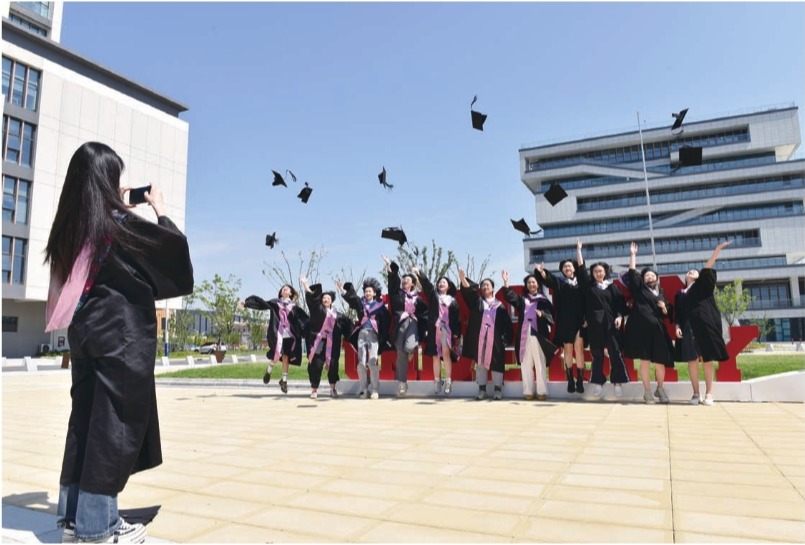 【江阴日报6月10日】眼下正值毕业季,去年投入使用的江南大学江阴校区也迎来了首届毕业生。图为数字科技与创意设计学院的毕业生们,正身着学士服拍摄创意毕业照。
