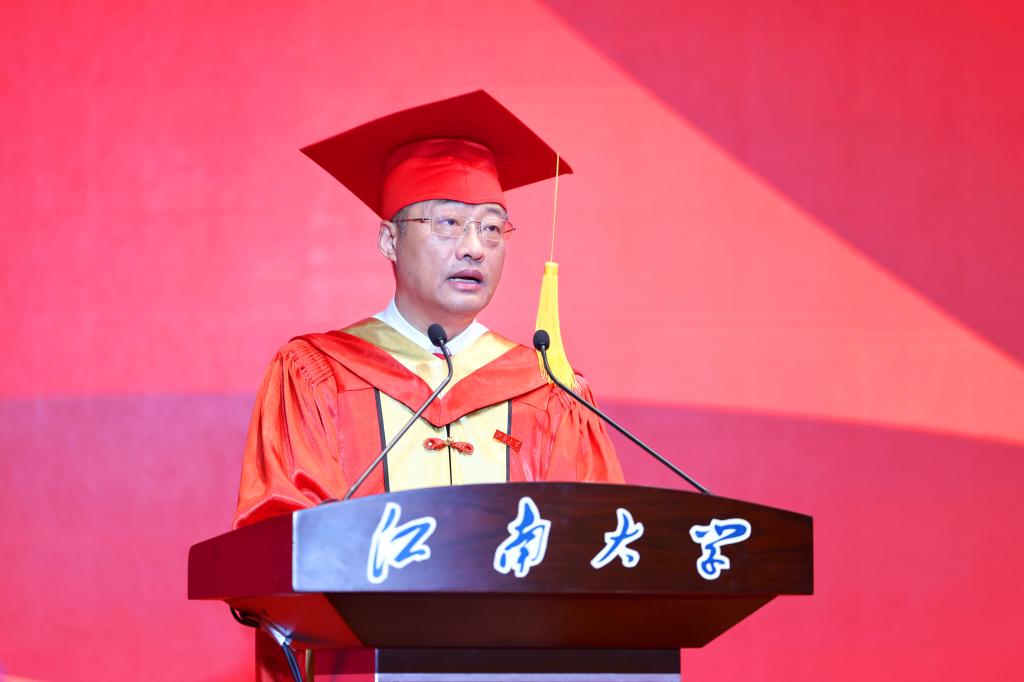 这些年,你们在江南沉淀力量,酝酿芳华。我知道,你们中有2476名同学将继续深造,其中临床2001班升学率达到了87.5%,大家用坚定的信念不断追求学术梦想;你们中有通过自己的创新研究,助力解决极端环境下的水资源匮乏问题,研究成果发表在《Cell》子刊上的纺织科学与工程学院余志华同学;有转专业后迎难而上取得50门课程满绩,连续两年斩获全国大学生生命科学竞赛国家级一等奖和国际遗传工程机器设计大赛金奖的生物工程学院陶孟瑞同学,大家用创新的思维不断深耕专业前沿;你们中有退伍回校后带领团队三赴贵州支教,赋能乡村振兴,荣登《人民日报》国家奖学金获奖学生代表名录的理学院王明礼同学;有在国家外事接待活动中表现突出,获驻外总领事馆致信感谢的物联网工程学院王佳宇同学,大家用赤诚的初心不断践行家国担当!同时,我也知道,还有一些同学可能正在面临就业的压力、学业的瓶颈或人生的迷茫,但大家却始终没有停下奋斗的脚步,江南大学为你们的坚守感到骄傲!我提议,让我们以最热烈的掌声,送给努力拼搏,一路向上的你们!