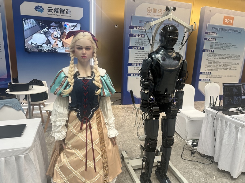 不远处,江苏云幕智造科技有限公司的展台前,一款名叫“小雪”的仿真机器人格外吸睛。她有着类似人类的皮肤质感,眼睛、眉毛、嘴唇等部位制作得也十分精细。“这是我们公司应用在文旅场景的仿真机器人,它的逼真程度在业内领先。”公司销售经理庄永杰介绍,目前企业仅在文旅场景就开发了40多款形象,是国内首批具备仿真皮肤人形机器人量产能力的企业之一。“我们的机器人具备全身66个自由度,仅面部就有26个,还具备仿生手臂与面部表情系统,集成自然语言处理与视觉感知能力,具有丰富的知识储备和语言积累。”