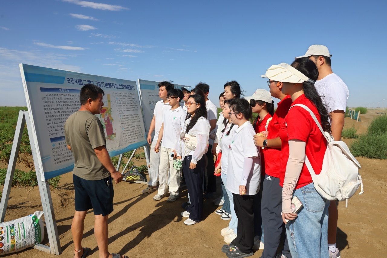 汽车穿行在沙漠公路上,队员们随后来到塔克拉玛干沙漠边缘,聆听讲解员讲述大漠边疆的“锁边工程”,从一棵树到一片林,再到如今3000余公里绿色阻沙带,30余万亩良田,一代代建设者兢兢业业、攻坚克难,以科技赋能,将“死亡之海”变为“希望之洲”。“以前只在课本里看到荒漠化治理,今天才真正明白什么是‘绿水青山就是金山银山’。”队员们被沙漠“锁边”“扩绿”的壮举深深震撼。