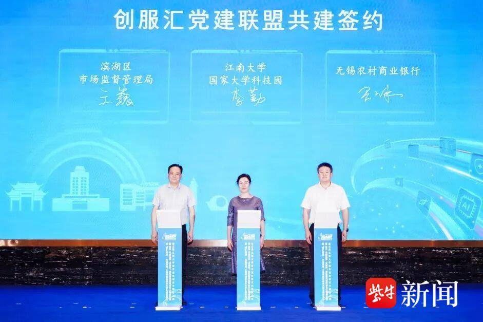 经过前期多方沟通,本次大赛已有项目意向在滨湖区落地,现场举办了意向项目落地签约仪式。山水城科技和投资促进局局长徐炜和江南大学国家大学科技园总经理李博与母乳寡糖生物制造等多个项目负责人签订意向项目落地协议,进一步深化了校政企合作,促进更多的科技成果在锡落地转化。无锡市滨湖区市场监督管理局党委书记、局长王巍,无锡农村商业银行无锡分行党委委员、副行长胥焱冰,资产管理经营有限公司总经理、国家大学科技园董事长李勤共同完成“大学科技园创服汇党建联盟”共建签约仪式,旨在通过党建引领,汇聚多方资源,构建更加完善的创新创业服务体系,为科技项目落地和校友企业成长提供支撑。