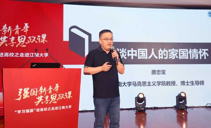 江南大学唐忠宝教授的演讲在现场掀起高潮。他以《谈谈中国人的家国情怀》为题,旁征博引、纵论古今,深刻剖析了文化基因与当代青年紧密相连的精神纽带。其精辟独到的见解、激情澎湃的讲述,引发了现场听众的强烈共鸣,会场内不时爆发出阵阵热烈掌声。