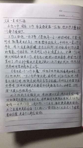 十七年前,张烽的儿子刚出生,如今已经上高二,他给远在前线的父亲写了一封信,信中这样写道:“在我父亲心中,国家、工作、家庭都是第一位的,我与母亲唯一能做的便是支持他。”