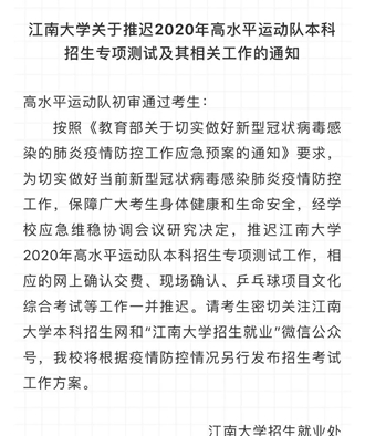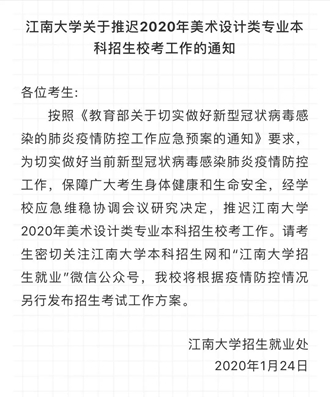 按照应急管理工作领导小组要求,江南大学2020年春季延期开学,艺术类专业、高水平运动队延期招生考试。同时,变更假期学生海外交流计划,开展线上社会实践活动。