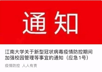 江南大学党政高度重视此次疫情的防控工作,严格按照教育部党组和无锡市人民政府的统一部署,对校园加强全天候管理,加强师生疫情防范教育。