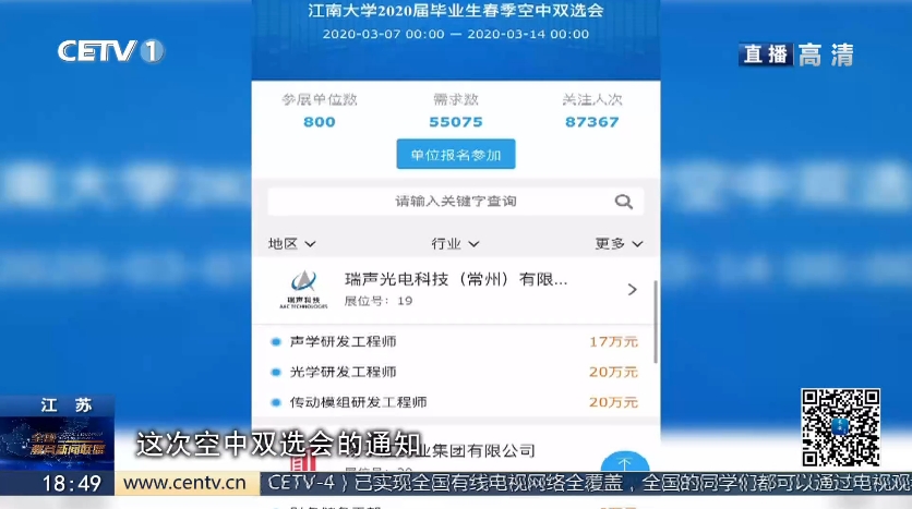 【中国教育电视台3月20日】近日,江南大学首场春季空中双选会正式上线,受到了众多用人单位的青睐。3月20日,中国教育电视台《全国教育新闻联播》栏目以“‘云招聘’为毕业生求职‘做嫁衣’江南大学多管齐下助推学子就业”为题对此进行了报道。以下为视频截图: