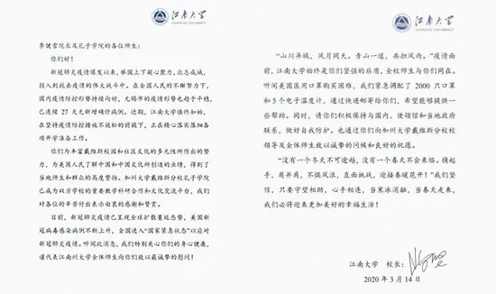 3月13日,江南大学副校长徐岩在听闻美国进入紧急状态的消息后,当即致函加州大学戴维斯分校副教务长、国际事务副校长Joanna Regulska教授,表示新冠肺炎疫情是全人类面临的共同挑战,江南大学愿与加州大学戴维斯分校一道携手抗击疫情,并代表学校捐赠2000个医用口罩和5个电子体温计给加州大学戴维斯分校。