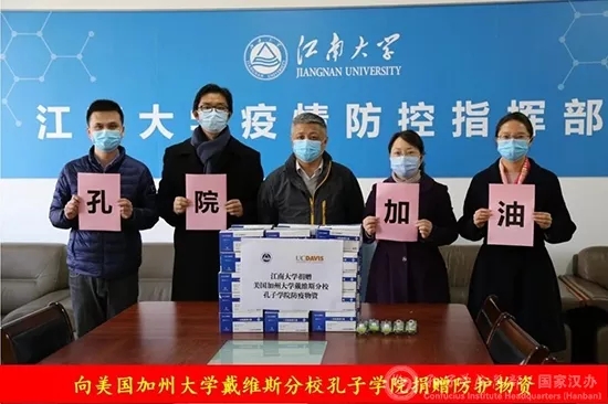 3月14日,江南大学校长陈坚向加州大学戴维斯分校孔子学院师生表达了问候和关心,由衷地赞扬了孔子学院教师的辛苦付出和取得的杰出业绩,并表示母校全体师生作为后盾,将积极提供帮助。在了解到美国医用口罩等防疫物资短缺、购买困难后,学校迅速寄出一批物资,支援孔院作防疫之用。