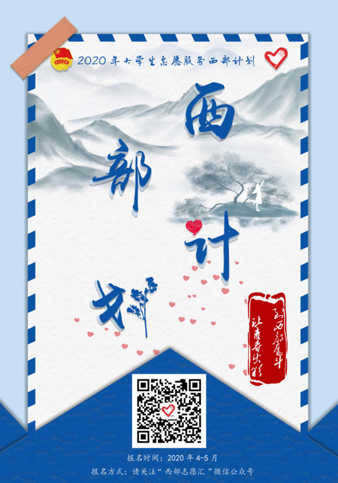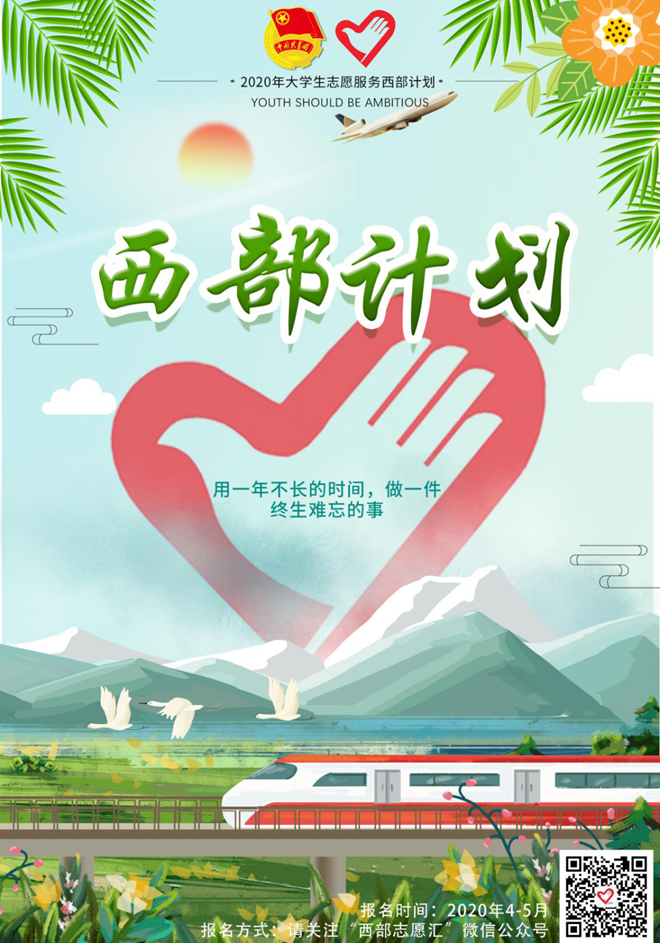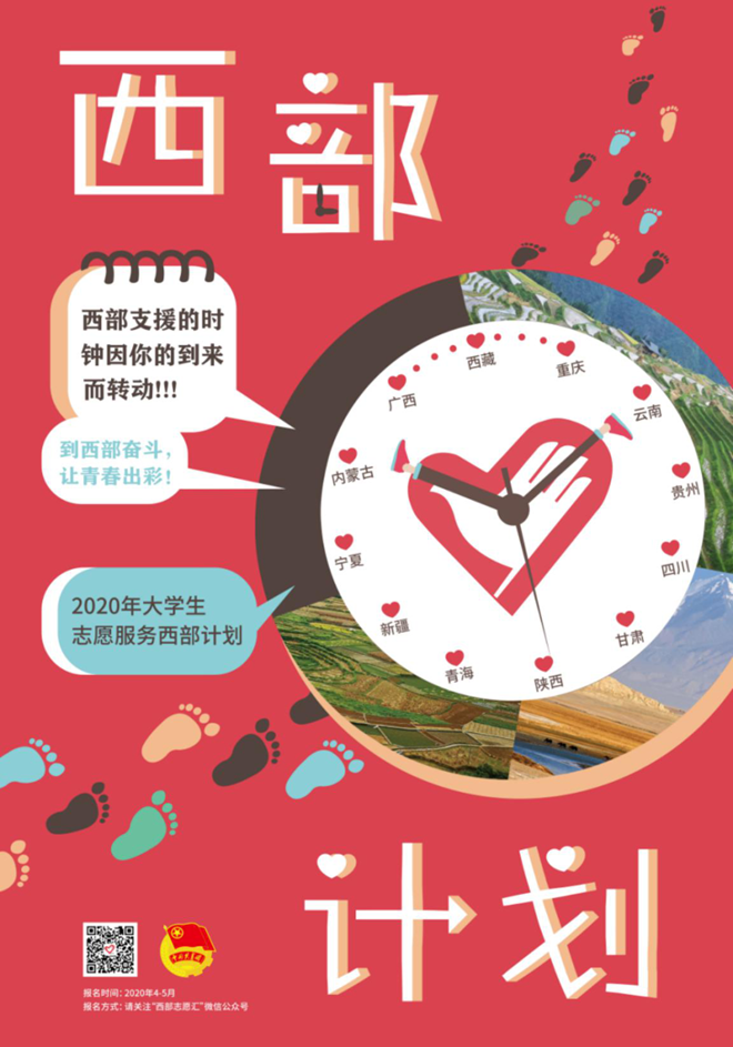【中国青年网4月17日】3月27日,西部计划全国项目办发布《志愿有我,创意先行|2020年西部计划海报征集令》,面向社会公开征集2020年西部计划招募宣传海报。征集令发出后,收到大量投稿。近日,中国青年网将对征集的优秀作品进行集中展示。