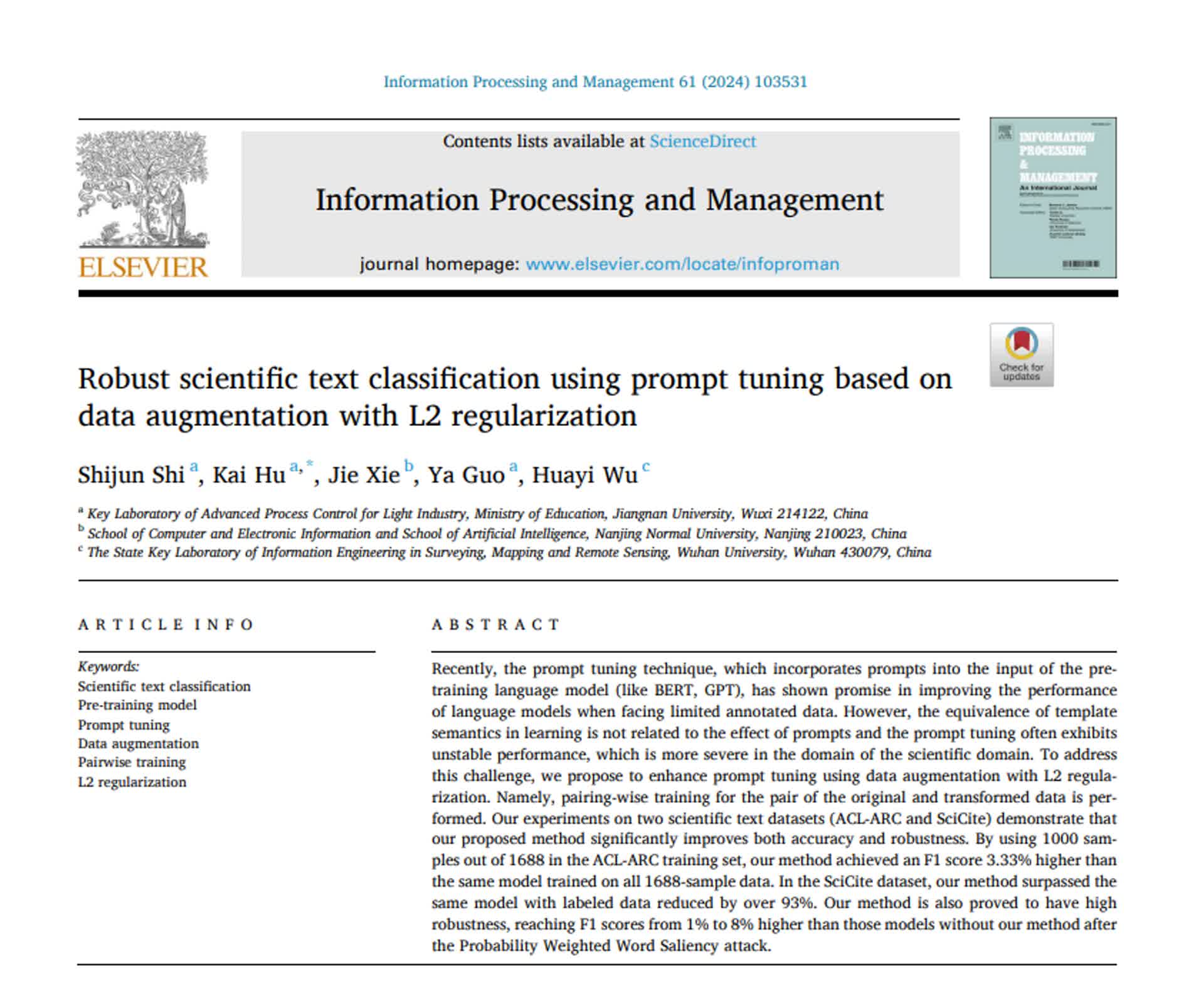 【交汇点12月5日】在文字语言信息的海洋中,一种新的数据增强和训练策略或许可以让人工智能更聪明。近日,江南大学物联网工程学院2020级本科生时世骏以第一作者身份在《信息处理与管理》(中科院一区,IF=8.6)发表题为“使用基于数据增强和L2正则化的提示学习进行鲁棒的科学文本分类”的学术论文,,该期刊是Elsevier出版社旗下信息科学领域的权威期刊之一。物联网工程学院胡凯副教授为该文通讯作者。