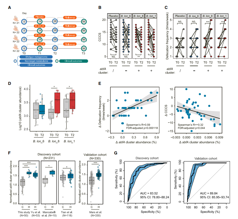 进一步研究表明,除长双歧杆菌外,对于其它肠道微生物(如拟杆菌等),abfA基因簇的存在与否与其缓解便秘的效果同样相关,同时证明功能性便秘患者肠道菌群中abfA基因簇丰度显著低于健康人,移植高abfA基因簇丰度粪菌可使无菌鼠便秘症状得到改善。此外,团队还发现,肠道微生物abfA基因簇丰度可以作为预测功能性便秘的生物标志物。