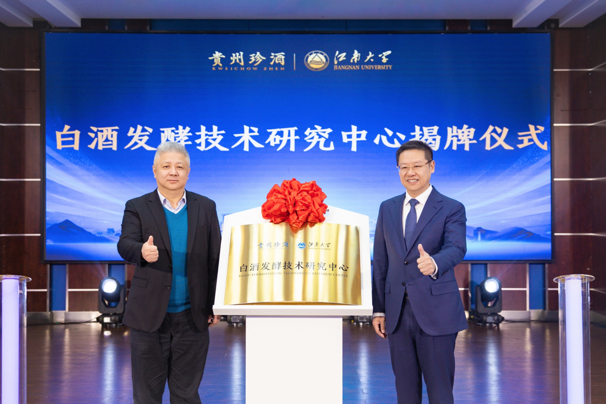 贵州珍酒与江南大学联合组建成立白酒发酵技术研究中心,将为珍酒提供技术支持,并围绕酱酒的发酵工艺、发酵微生物、风味感知等前沿技术和应用技术进行研究,并形成科研成果。徐岩与吴向东共同为研究中心揭牌。