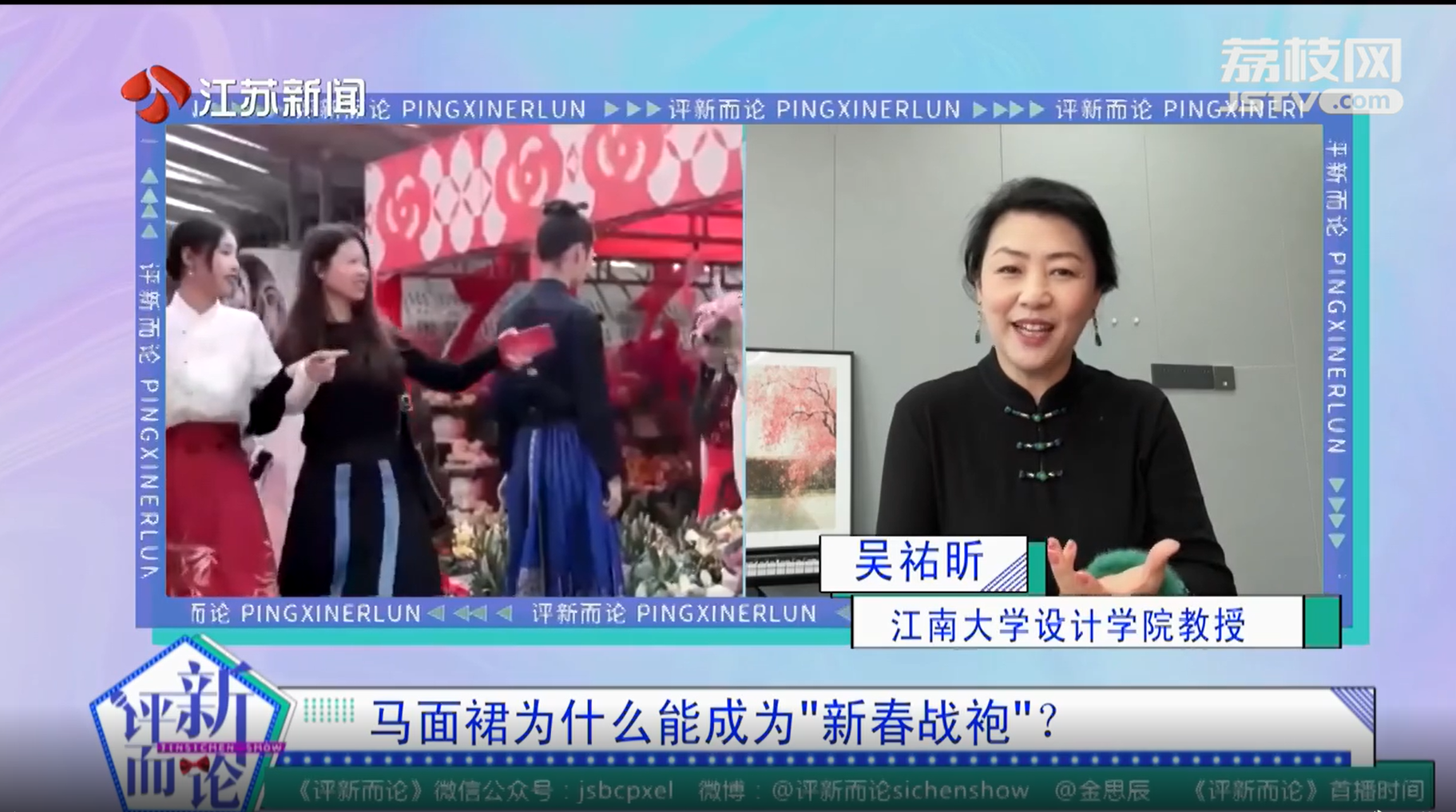 【江苏卫视2月25日】近日,江南大学设计学院教授吴祐昕接受江苏卫视采访,针对“马面裙为什么能成为‘新春战袍’?”进行评论,相关内容在江苏卫视新闻频道《评新而论》栏目播出。