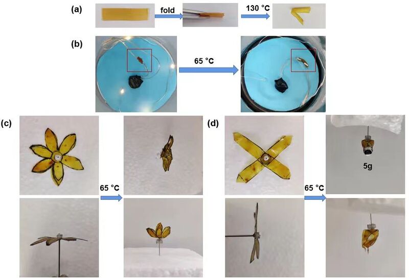 (a)不含HPASi的水凝胶的形状记忆性能;(b)灯泡开关;(c)花瓣闭合;以及(d)抓取5 g重量的图片