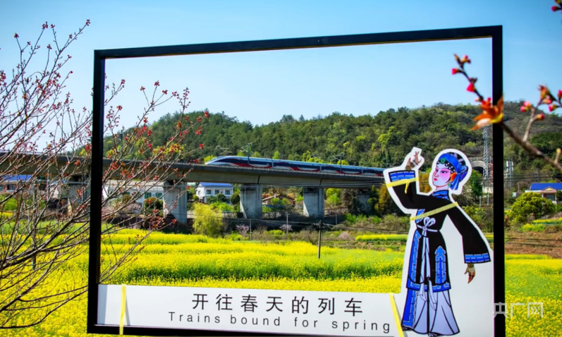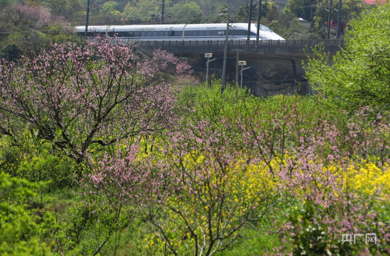 萱洲镇的油菜花、桃花竞相绽放,和白色的列车相互映衬,成为亮丽的风景线(央广网发 曹正平 摄)