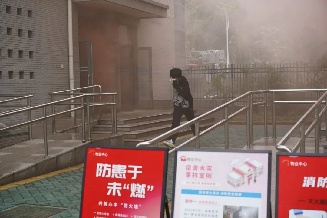 随着警报声响起,疏散演练在学校宿舍楼正式开始。紧急疏散工作预案立即启动,同学们迅速进入紧急疏散状态,捂住口鼻并弯腰,按照既定路线有序撤离,学校安保人员、“火焰蓝”大学生志愿者在楼梯口进行疏导工作,做到了快速、安全、有序到达操场。