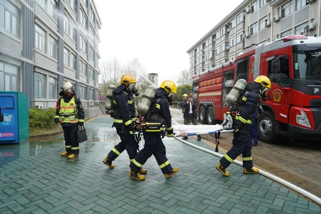 随后,消防车入场,一组消防员进入内部搜救,将一名伤员用担架抬出,另一组消防员负责内攻寻找火点灭火,被“困”在宿舍楼四楼的两名学生用登高平台车撤离,演练最终获得圆满成功。