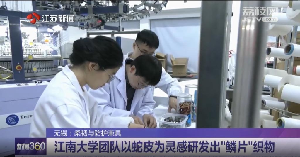 【江苏新闻频道5月7日】5月7日晚,江苏新闻频道《新闻眼》以《柔韧与防护兼具 江南大学团队以蛇皮为灵感研发出“鳞片”织物》为主要内容,报道我校纺织科学与工程学院研究成果。