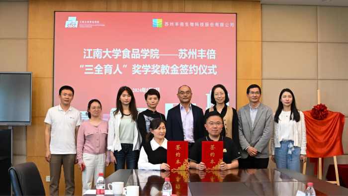 随后,院企双方签订捐赠协议并为“江南大学食品学院——苏州丰倍‘三全育人’奖学奖教金”揭牌。据悉,此次苏州丰倍在江南大学设立首个以“三全育人”为主题的二级学院奖学奖教金,着重激励在大学生思想政治工作和育人全过程中付出心血努力和作出卓越贡献的食品师生,旨在积极构建企业和高校之间的产教融合创新平台,全力支持江南大学食品学院立德树人、率先垂范,为健康中国建设和国计民生发展贡献源源不断的智慧和动能。