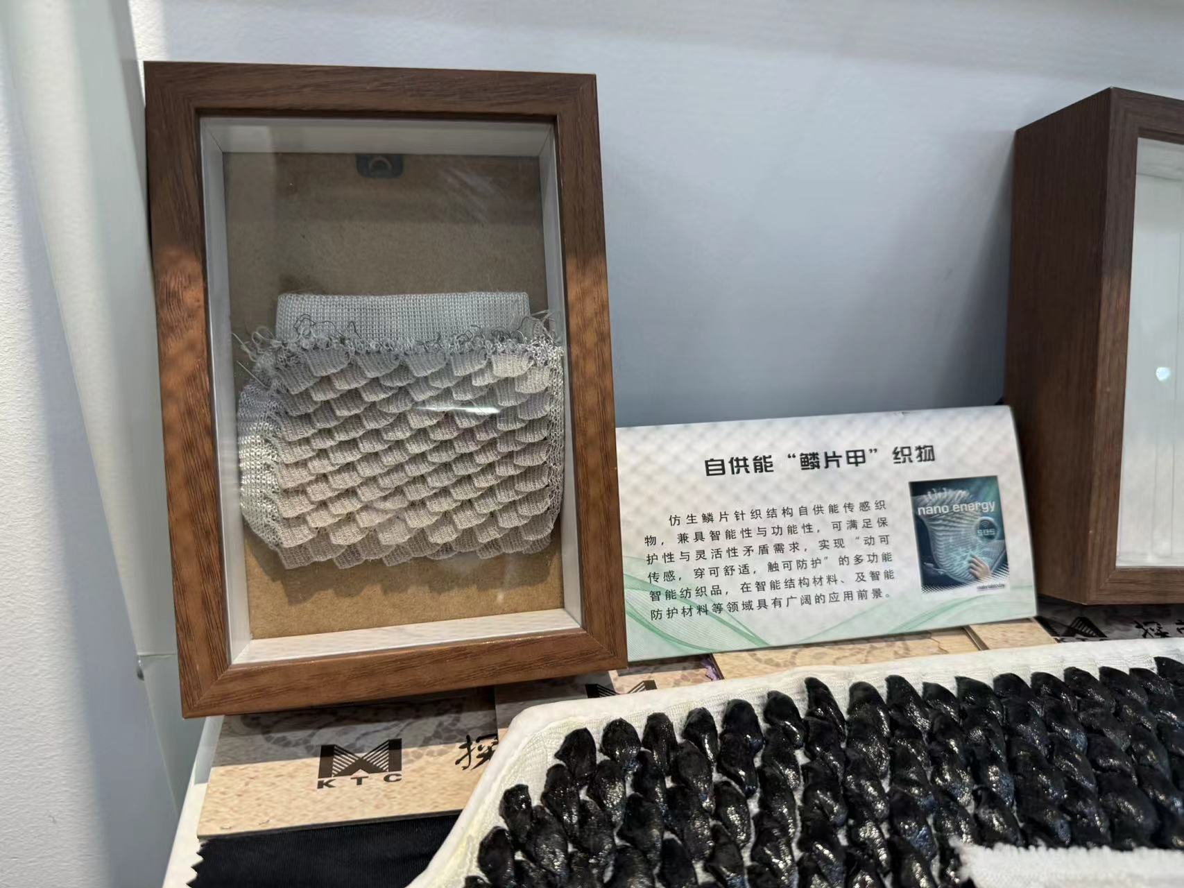 在成品展示台上,只见一块白色的有着一个个鱼鳞一样凸起立体的针织物。用手摸一摸,纺织物的柔性很好,一个个重叠“鳞片”软中带硬。江南大学纺织科学与工程学院副研究员陈超余向记者介绍:“蛇皮由鳞片组成,既柔软又坚硬。我们就是受到蛇皮这种重叠结构的启发,有了最初设想。”