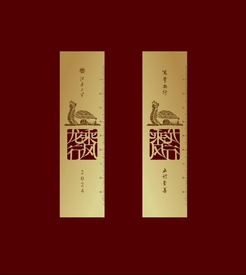 在录取通知书的内页,有两把铜尺。铜尺两面,镂刻着神鼋图案。神鼋相传为龙之第六子,象征吉祥长寿,善负重且前行不辍。其铜像坐落在太湖之滨(鼋头渚)和江南大学坐落的蠡湖之畔。它们承载着希望学子们身体康健、行稳致远的美好祝福。此外,这把具有刻度的铜尺凝聚了遵守准则、衡量自我、跬步千里和丈量世界的深远寓意。