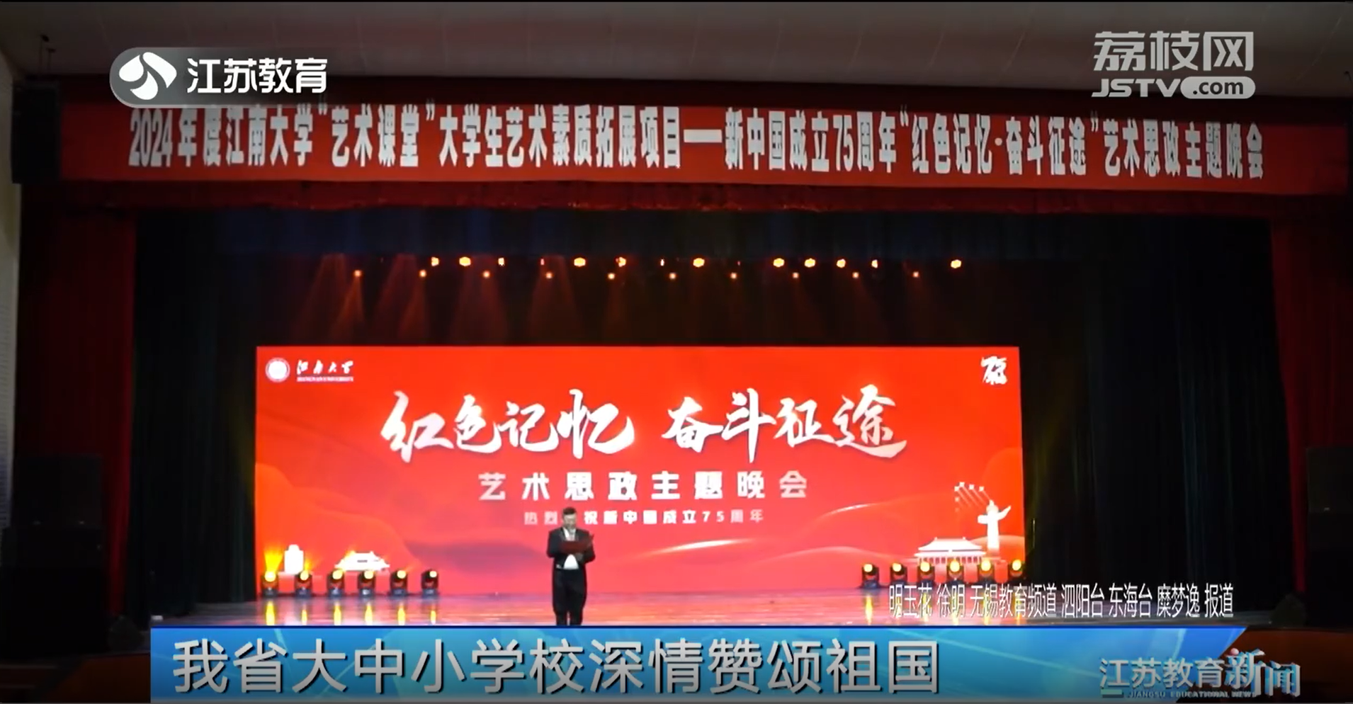 【江苏教育频道10月1日】10月1日晚,江苏教育频道《江苏教育新闻》栏目报道我校举办庆祝新中国成立75周年“红色记忆·奋斗征途”艺术思政主题晚会。