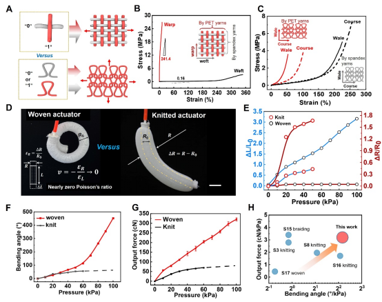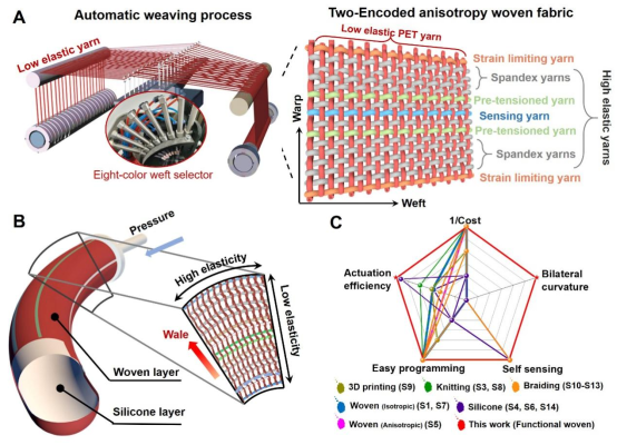 团队负责人孙丰鑫介绍,传统的软气动驱动器通常采用硅胶等弹性材料,充气时会产生全方位的“气球式”膨胀,变形操控性较差。而该研究团队所研制的编织驱动器,是以织物结构和材料组合、运用经纬纱双系统的机织工艺设计而成,通过定制化设计编织层不同区域的纱线张力形态,有效控制不同区域的弹性差异,从而实现了气动机器人的“智能”变形。