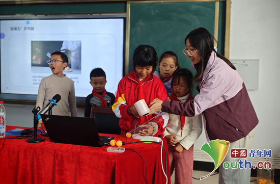 研支团成员为孩子讲解机械知识。江南大学研支团云南队供图
