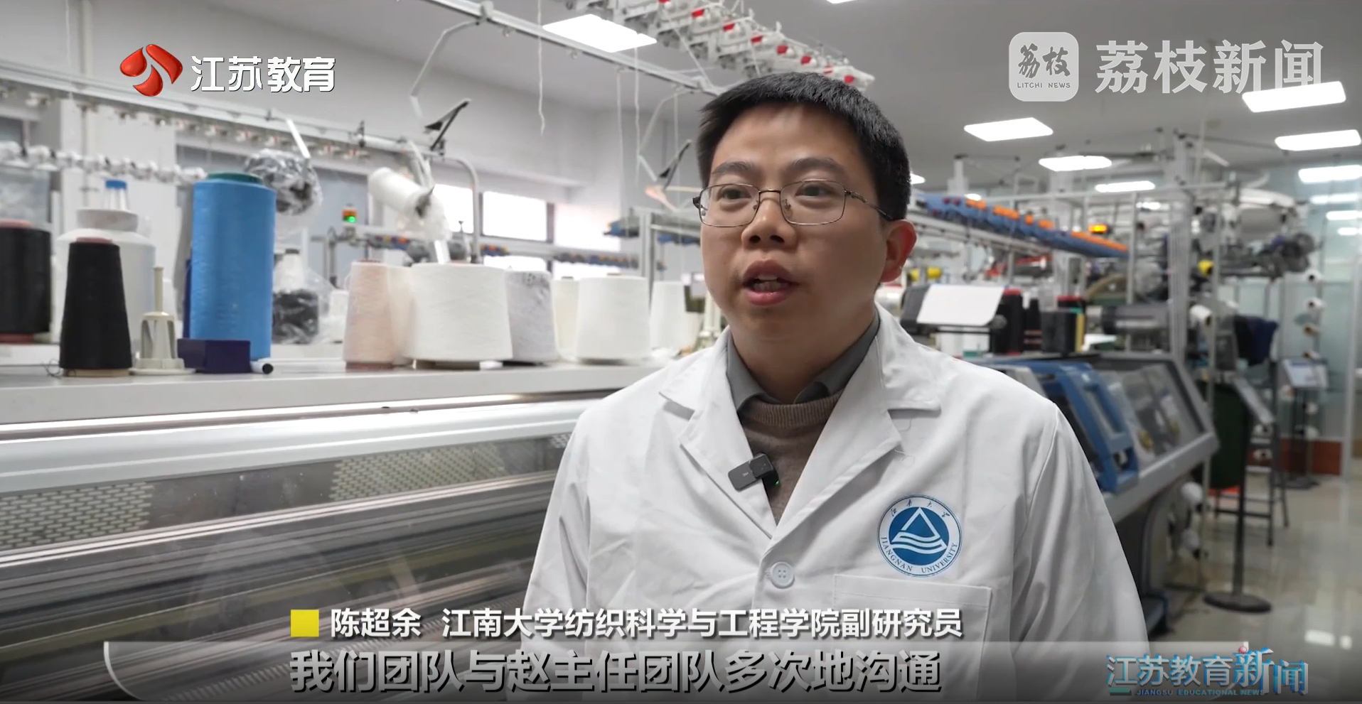 【江苏教育频道2月21日】2月21日晚,江苏教育频道《江苏教育新闻》栏目以“江南大学团队研发出一款断指再植术后监测织物”为题,纺织科学与工程学院副研究员陈超余团队日前研发出一款用于术后监测的织物,它柔软、透气且具有良好的生物相容性,能在极短时间内响应温度变化,并具有极高的灵敏度,可大大提升医护人员术后监测的精准度。