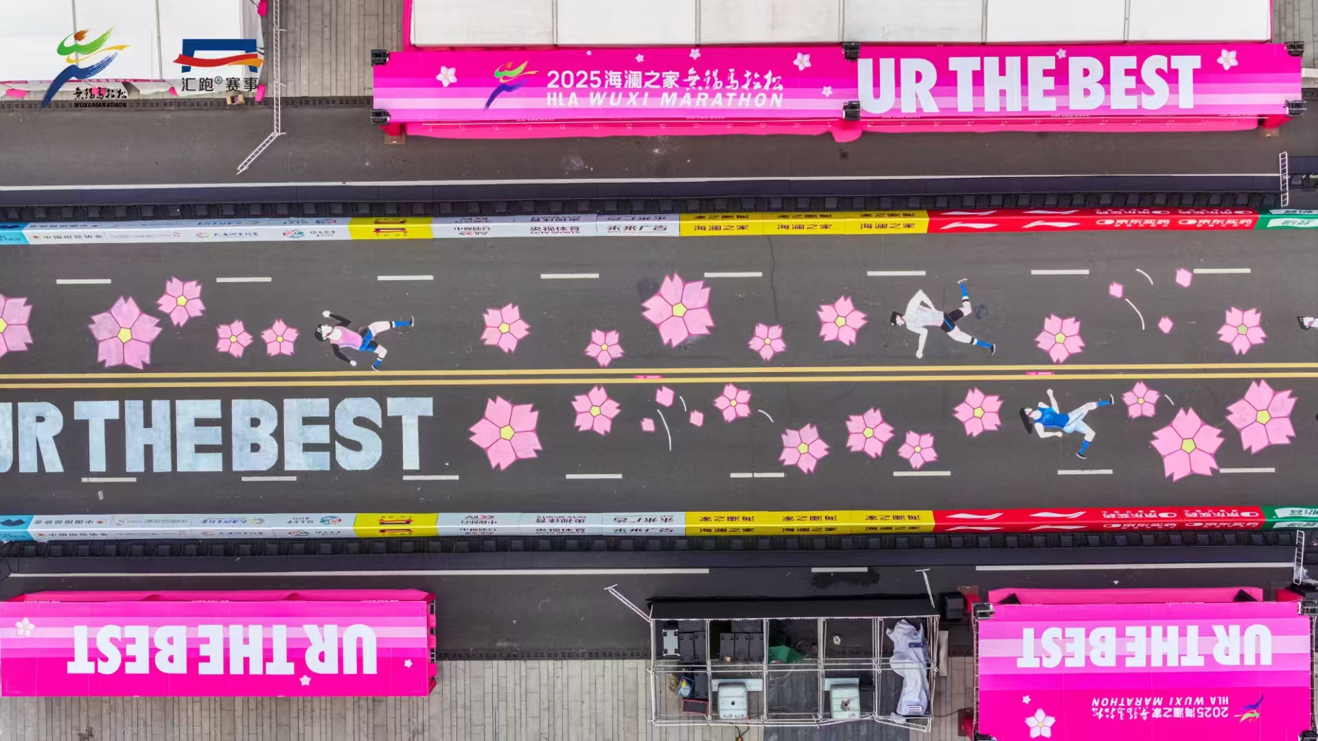 同样打开校门的还有江南大学。3月23日,2025年无锡马拉松鸣枪开跑。其中,半程马拉松终点就设在江南大学体育中心。除了道路两侧热烈的欢呼与加油声,当不少跑者在跑进半马100米冲刺赛道时,发现地面还有惊喜。原来,柏油马路上点缀着朵朵樱花和跑者的形象。“玫红色的樱花主色调是春天江南大学的颜色,也体现了青春亮丽、运动的激情,也体现了锡马‘人在画中跑’的理念。” 彩绘设计者之一、江南大学设计学院杨永俭老师介绍。