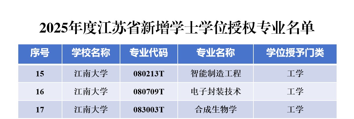 近日,江苏省学位委员会、江苏省教育厅发布了《省学位委员会省教育厅关于公布2025年度新增学士学位授权专业名单的通知》(苏学位字函〔2025〕2号),我校智能制造工程、电子封装技术和合成生物学3个专业成功新增为学士学位授权专业。