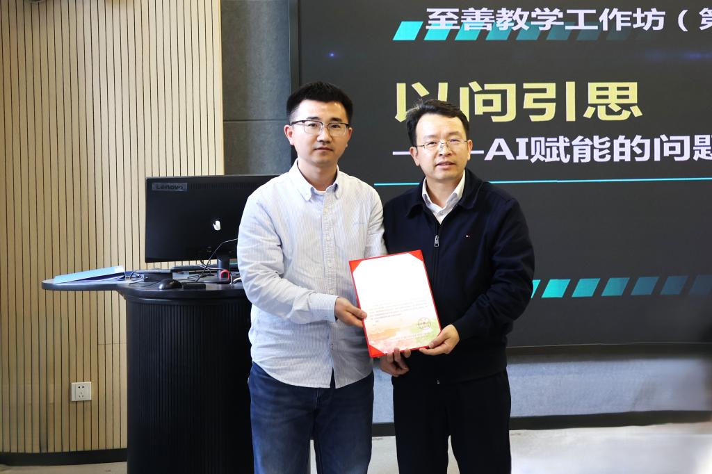 李兆丰在讲话中深刻阐释了工作坊的创办意义与人工智能时代教学变革的方向。他表示,人工智能正深刻重塑教师的角色定位与课堂形态,未来的教学不再是单向的知识传递,而是人机协同、以问引思的深度对话场域。至善教学工作坊是学校贯彻落实国家教育数字化战略行动、推动人工智能与教育教学深度融合的重要举措,主要聚焦人机协同教学设计的“真问题”,通过“观摩—解构—共创—生成”的闭环研修模式,为教师提供了可复制、可迁移的实战演练平台。他勉励广大教师主动拥抱技术变革,在坚守育人初心的同时善用AI提升教学效能,让技术真正服务于学生思维发展和创新能力培养。会上,李兆丰代表学校向参与工作坊的指导教师王锐颁发感谢信并对他潜心教书育人表示诚挚感谢。