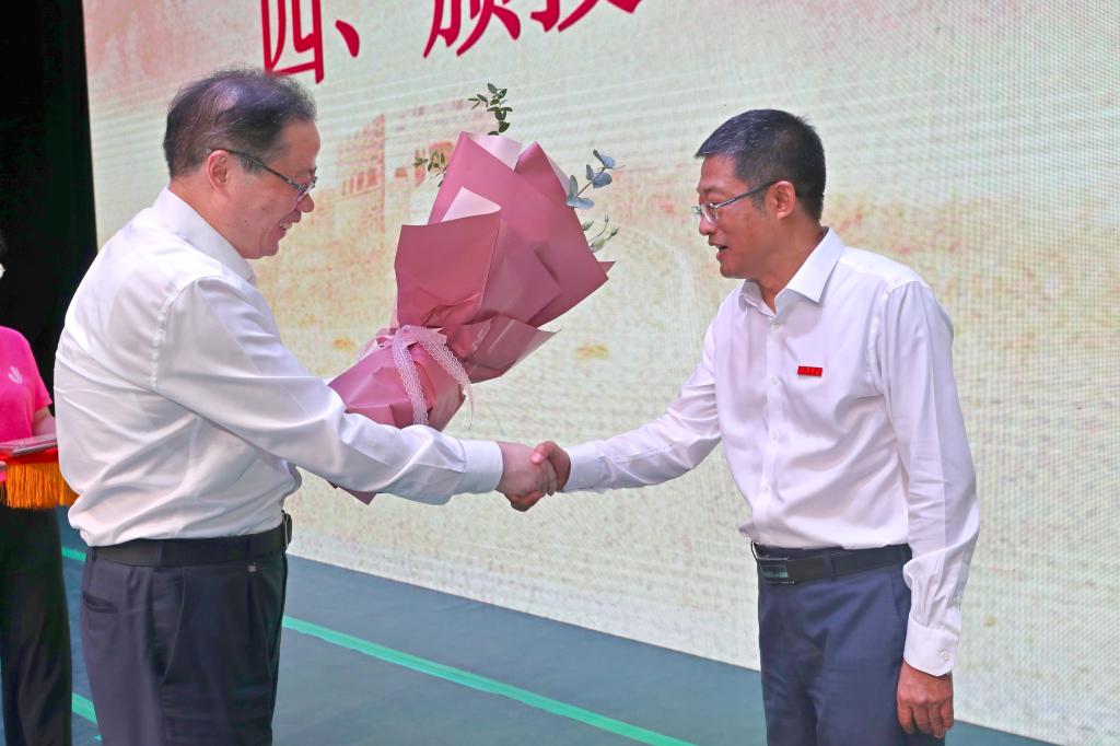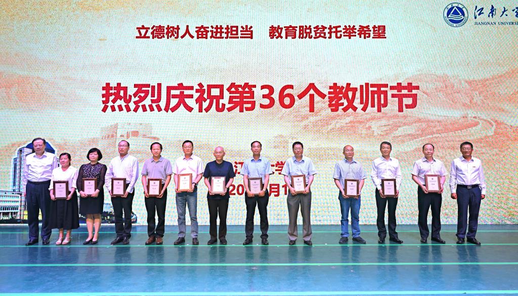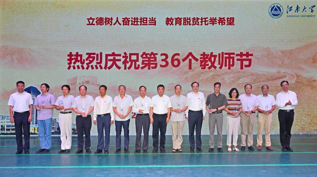 会上,顾正彪代表学校,向市委市政府长期以来对江南大学的关心和支持,表示诚挚的感谢。杜小刚、朱爱勋、金元兴、朱庆葆、陈卫为学校2020年度三十年教龄教师颁发纪念奖杯,并与他们一一握手合影,向他们三十年对教育事业的坚守和付出致敬,现场响起真诚、热烈的掌声。