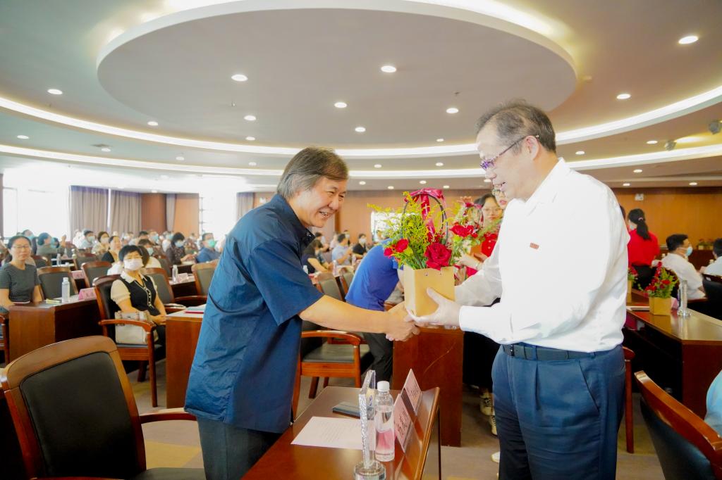 校党委书记朱庆葆向三十年教龄教职工颁奖献花